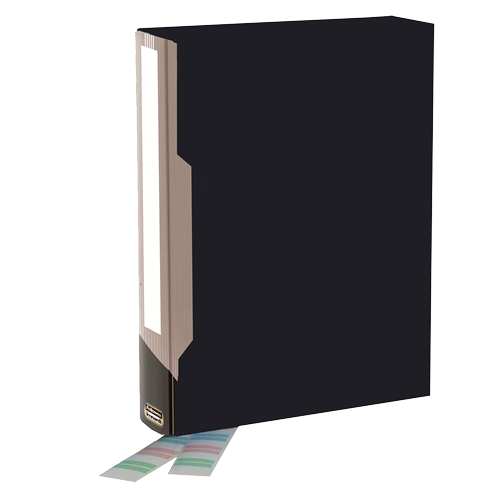 Una carpeta porta-fundas fabricada en polipropileno flexible con etiquetas de personalización para el lomo. Consta de 100 fundas que impiden el reflejo de apertura superior. Incluyen una caja rígida en la entrega.