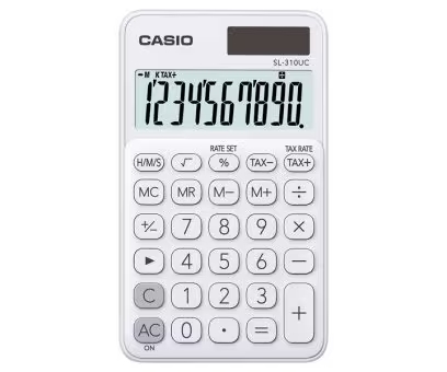 Casio SL-310UC Calculadora de Bolsillo con Pantalla LCD de 10 Digitos – Calculo de Impuestos – Alimentacion Solar y Pilas – Compacta y Ligera – Color Blanco
